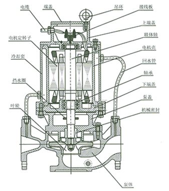 机组由水冷电机与泵组成,机泵一体结构,电机与泵同轴。电机采用泵介质进行循环冷却,改变电机用风冷方式,同时由于电机外壳加有冷却套,使电机内部产生的噪音得到有效降低。电机部件主要有定转子部件、冷却套、回水管,上端盖等组成。泵主要由泵体、叶轮、泵盖、机械密封等组成。泵进出口在统一水平轴线上,便于管道连接布置,泵内具有平衡轴向力系统,使泵运行时轴向力降至最低,剩余轴向力由电机内轴承承受。泵设有放气孔、放水孔及底座,便于安装使用。